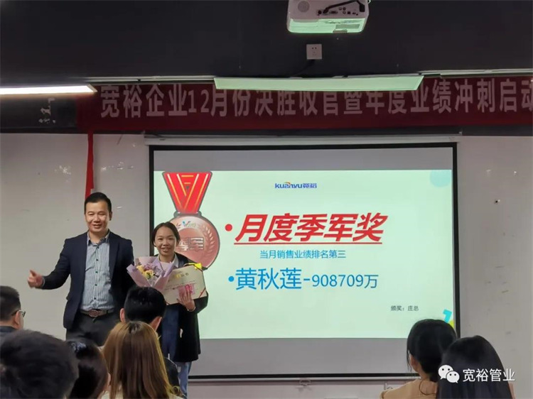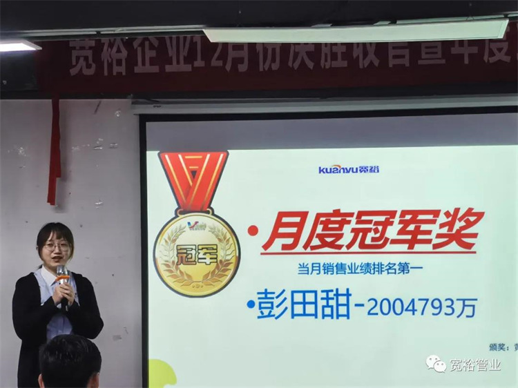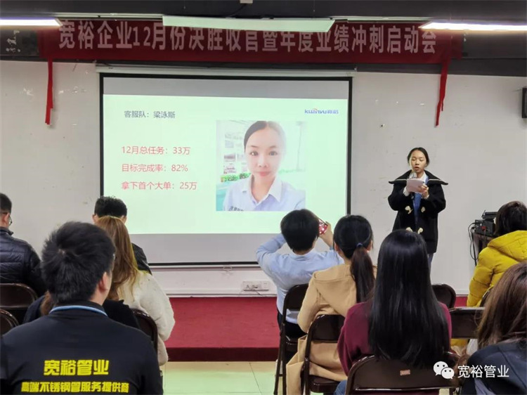 動(dòng)感滿滿的舞蹈之后正式開啟對(duì)12月1-13日的銷售業(yè)績回顧,并對(duì)個(gè)人銷量前十、團(tuán)隊(duì)業(yè)績完成情況、團(tuán)隊(duì)PK情況等進(jìn)行了總結(jié)。在過去的13天里,已經(jīng)涌現(xiàn)出了多位優(yōu)秀的將士,他們分別是以100%業(yè)績率先沖刺的00后新生代“小莊”,還有首個(gè)拿下本月25萬大單的小斯---從跟單員通過不斷的努力成為優(yōu)秀的銷售工程師。更有通過前期不斷積累了成功開拓經(jīng)驗(yàn)的來自無敵隊(duì)的小黃,12月至今已經(jīng)開發(fā)了6個(gè)新客戶,現(xiàn)場更是迎來了“哇塞”的喝彩聲一片!在此小編也僅代表寬裕管業(yè)對(duì)各位優(yōu)秀戰(zhàn)士的優(yōu)異成績表示大寫的點(diǎn)贊!你們是最棒的!