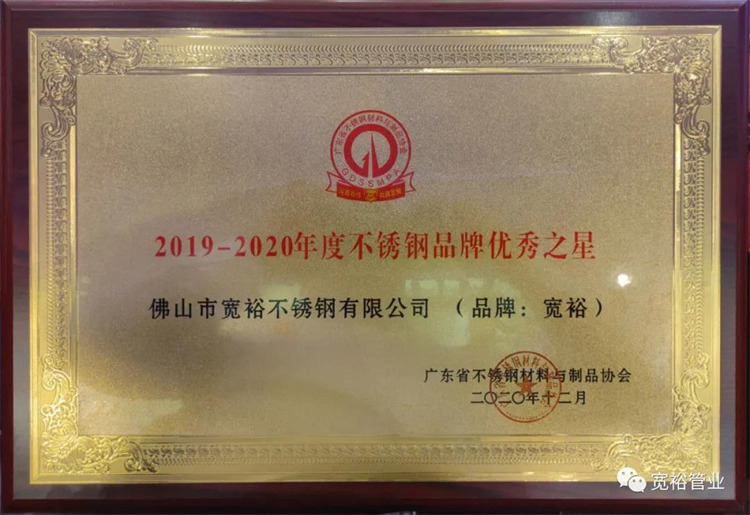 過去10年,寬裕企業(yè)載譽無數(shù)!12月23日晚再獲殊榮!其中,寬裕品牌榮獲廣東省不銹鋼材料與制品協(xié)會頒發(fā)的2019-2020不銹鋼行業(yè)品牌優(yōu)秀之星;寬裕企業(yè)榮獲“放心消費示范點企業(yè)”榮譽稱號!無數(shù)榮譽的背后是全體寬裕人共同努力的成功,更有廣大客戶對我們的支持和信任!再次深表感謝!我們定必再接再厲,不斷創(chuàng)新,奮勇向前!