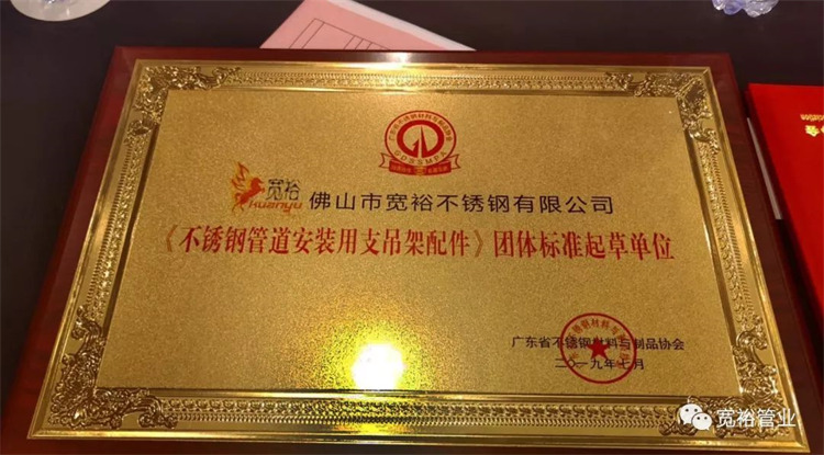 佛山市寬裕不銹鋼有限公司被授予《不銹鋼管道安裝用支吊架配件》團(tuán)體標(biāo)準(zhǔn)起草單位及起草人牌匾及證書。